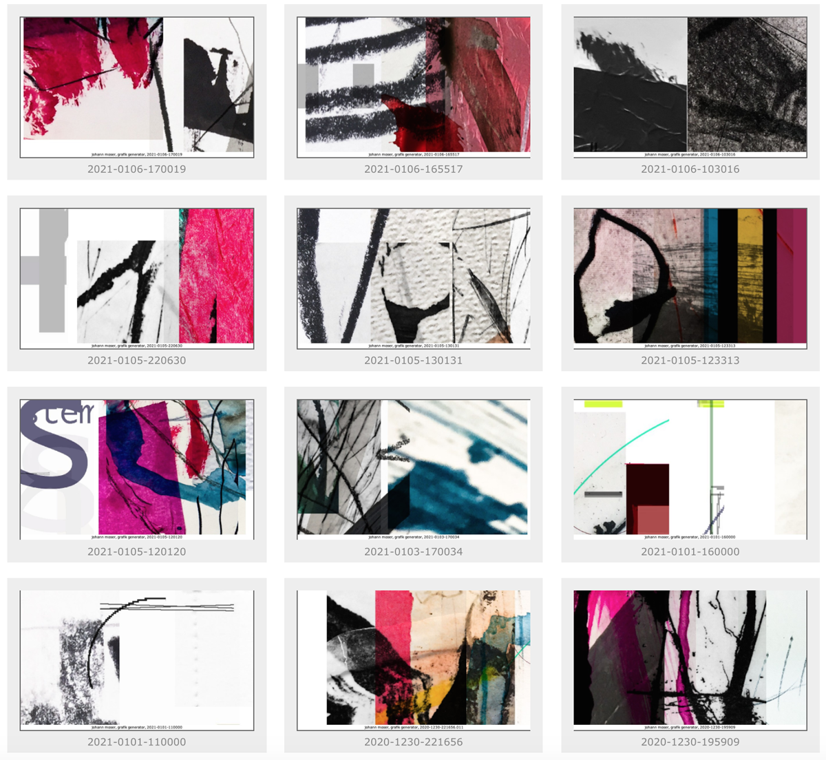 Kürzlich habe ich die Anregung des Kurses Proportion | Der Goldene Schnitt aufgegriffen, einen Goldenen-Schnitt-Raster auf Transparent-Papier über bestehende Werke zu legen. Auf diese Weise habe ich Dutzende Ausdrucke meines GrafikGenerators analysiert (Konzept und Beispiele: https://kunst.standpunkte.at/grafik-generator-images/). Und sehr oft spielt bei den Bildern, die ich als gelungen gewählt habe, das Verhältnis des Goldenen Schnitts eine Rolle. So sind manchmal die Flächen exakt nach dem Goldenen Schnitt geteilt, manchmal befinden sich Schwerpunkte an den Linien oder Schnittpunkten oder umspielen lineare Strukturen die Teilungen. Sogar verschobene Flächen in der „richtigen“ Größenordnung dominieren auf diese Weise.