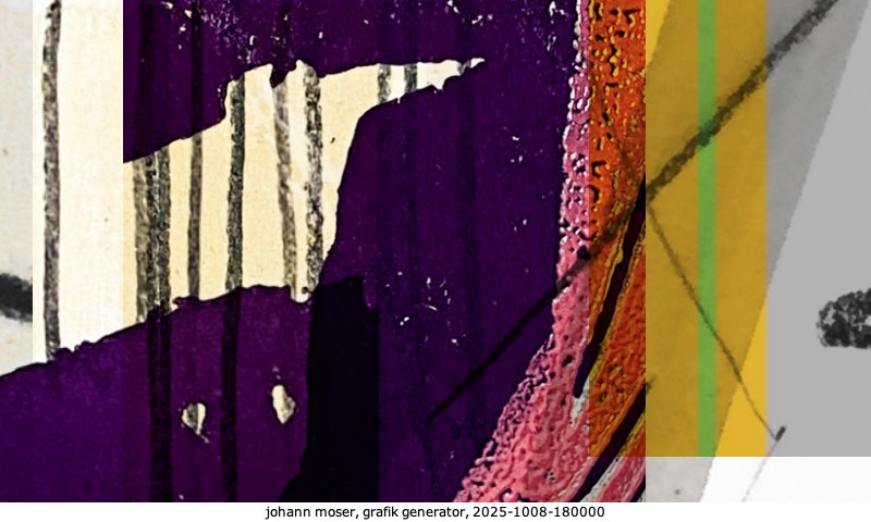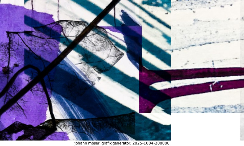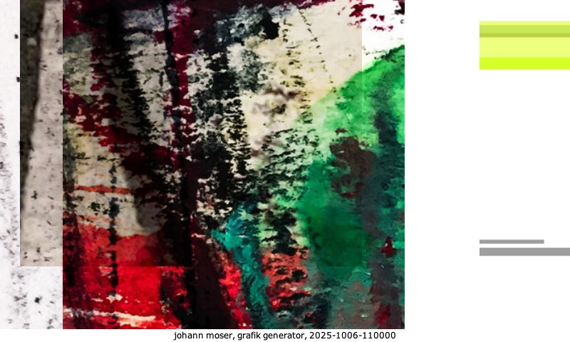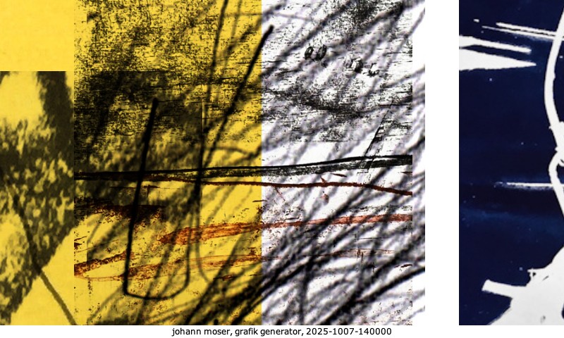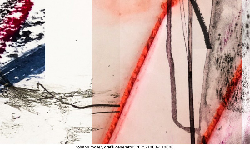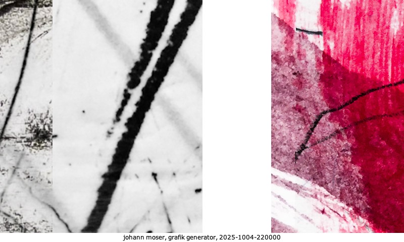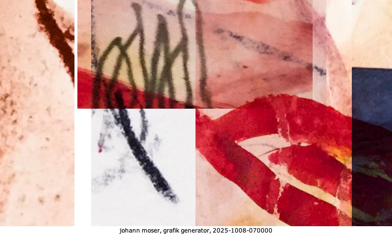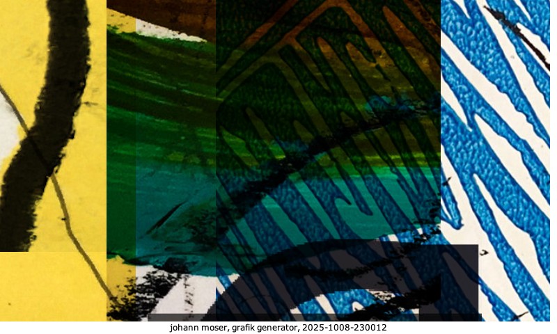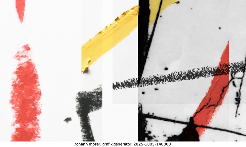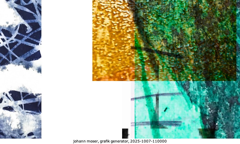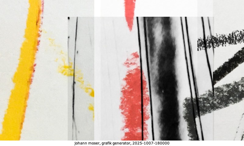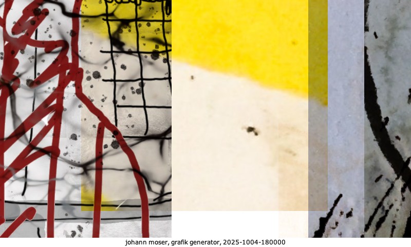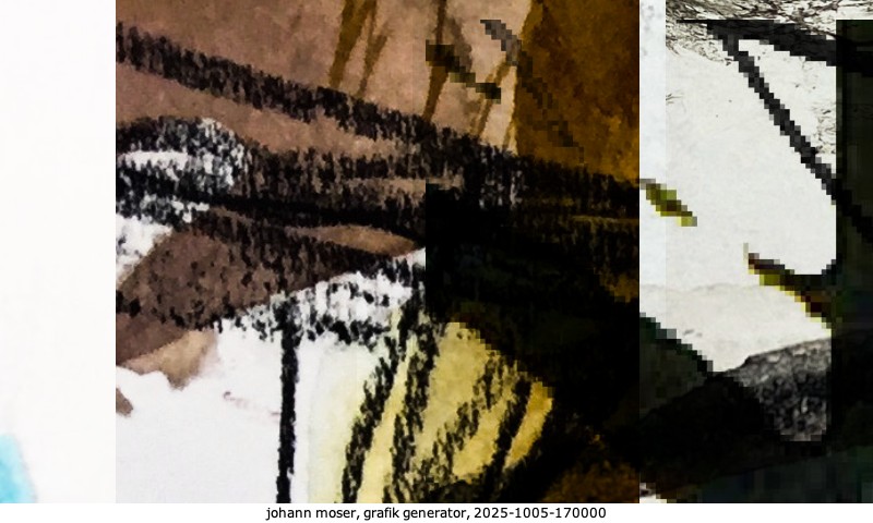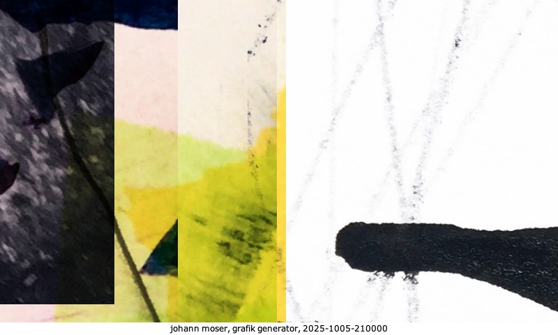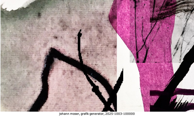 Das Projekt grafik generator habe ich in mehreren Beiträgen auf kunst.standpunkte.at beschrieben. Die Grafiken werden aus einer Sammlung von derzeit meiner Bilder, Zeichnungen und Grafiken generiert. Diese Basis werde ich laufend erweitern. Damit ändert sich ganz langsam die Ästhetik der vom grafik generator generierten Bilder. Die Signatur gehört zum Bild und weist es als Teil eines umfassenderen Projekts aus. Bitte lasse die Signatur daher auf dem Bild.