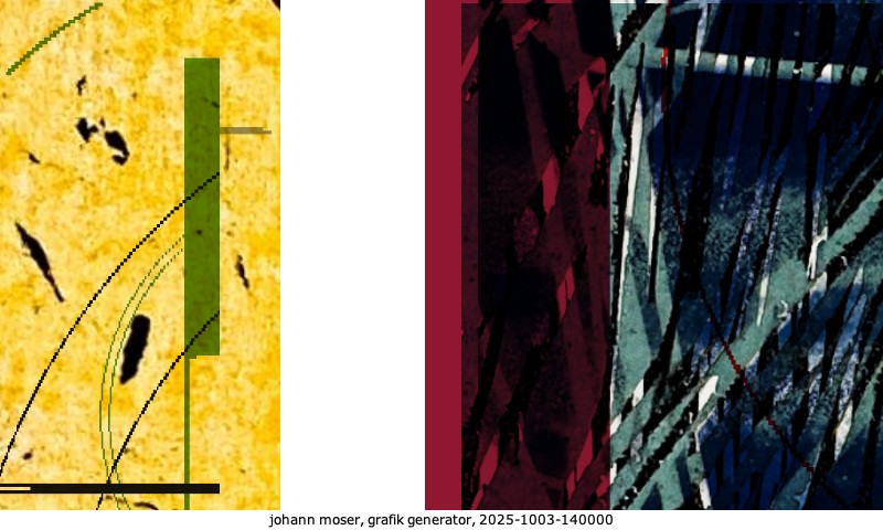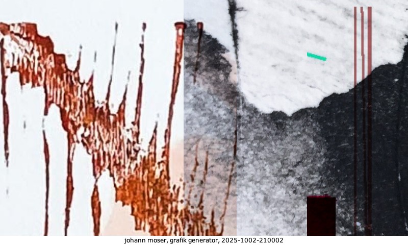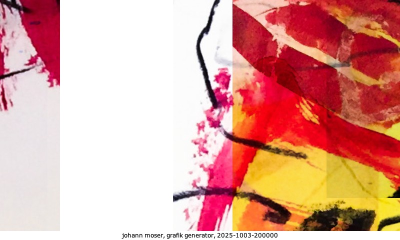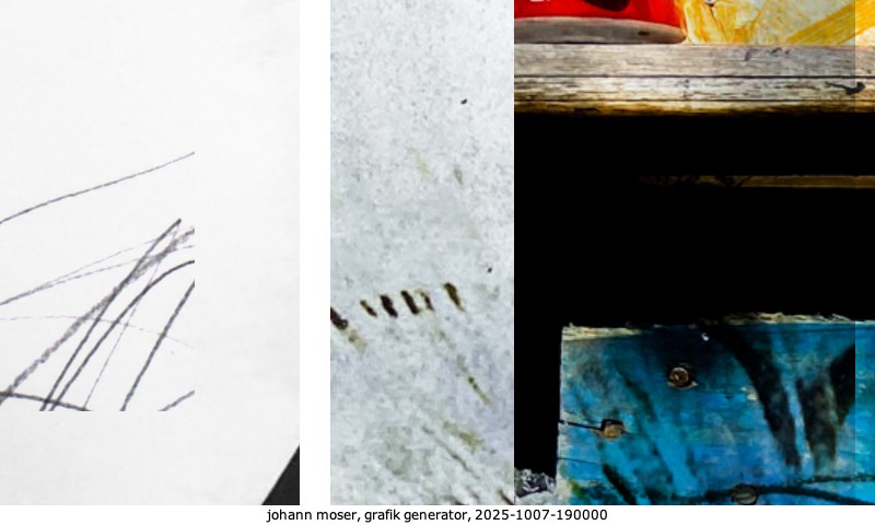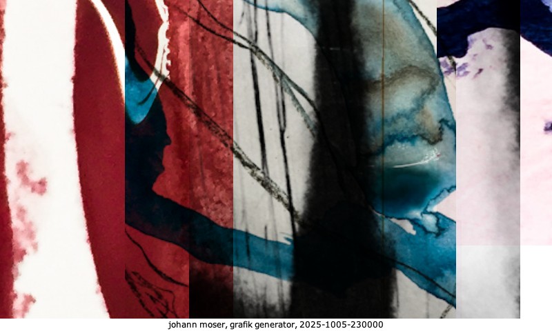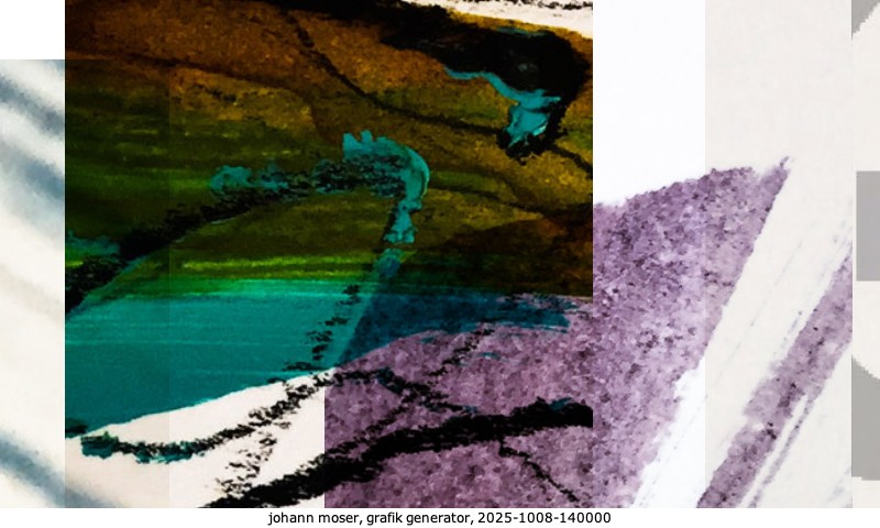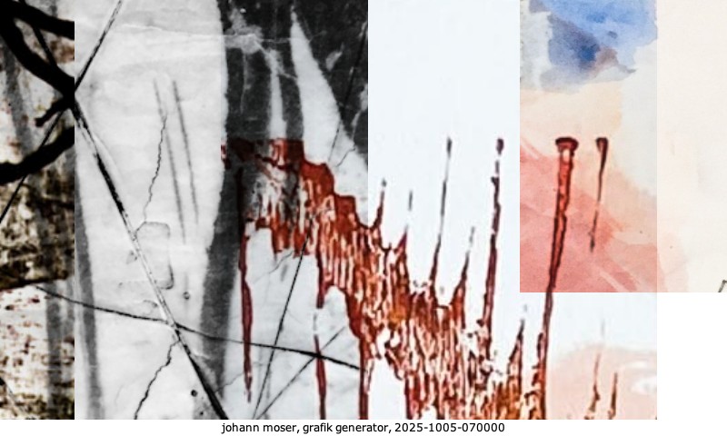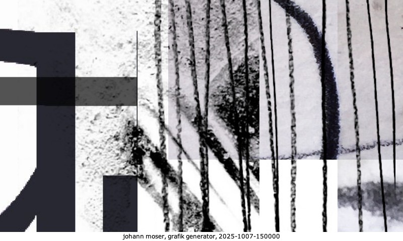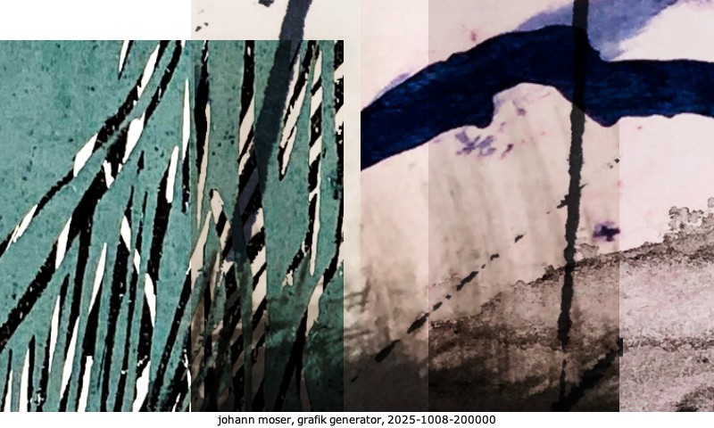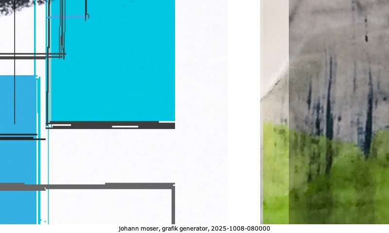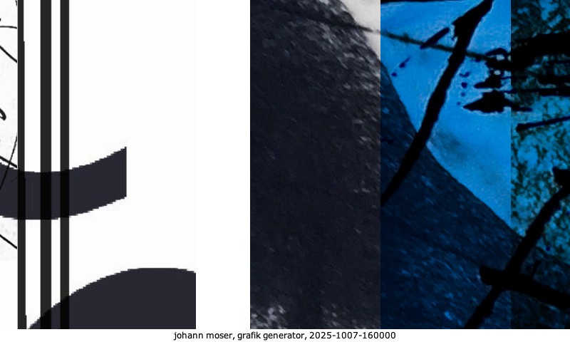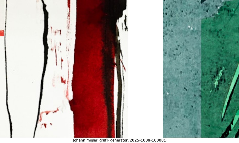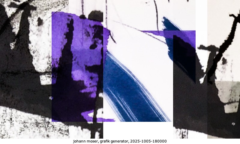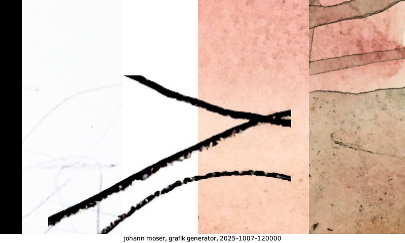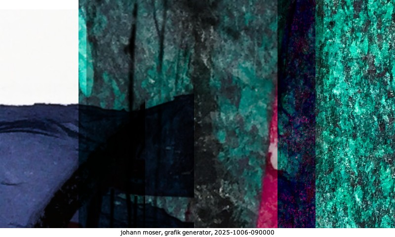 Das Projekt grafik generator habe ich in mehreren Beiträgen auf kunst.standpunkte.at beschrieben. Die Grafiken werden aus einer Sammlung von derzeit meiner Bilder, Zeichnungen und Grafiken generiert. Diese Basis werde ich laufend erweitern. Damit ändert sich ganz langsam die Ästhetik der vom grafik generator generierten Bilder. Die Signatur gehört zum Bild und weist es als Teil eines umfassenderen Projekts aus. Bitte lasse die Signatur daher auf dem Bild.