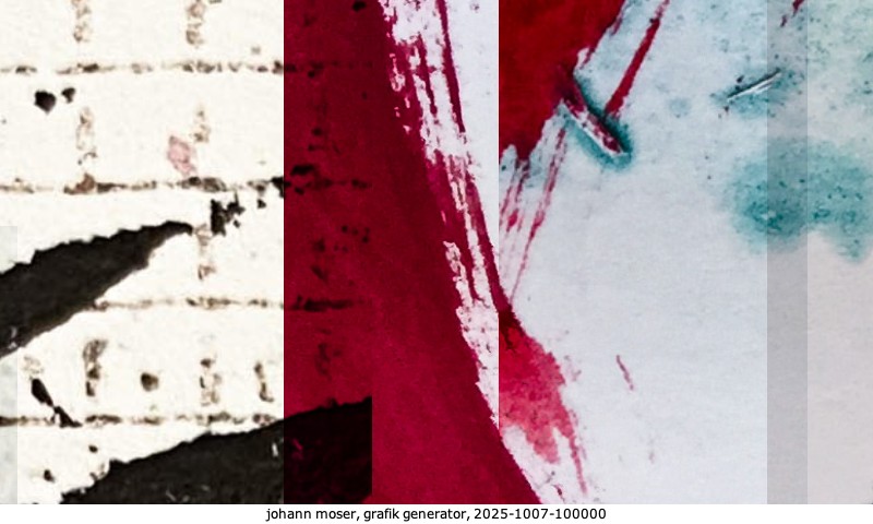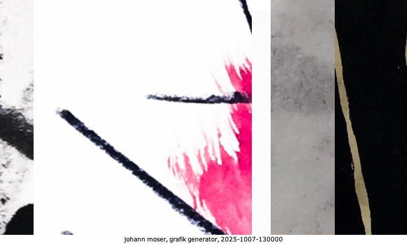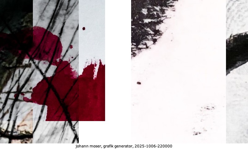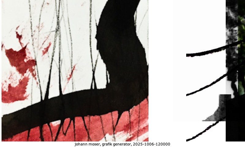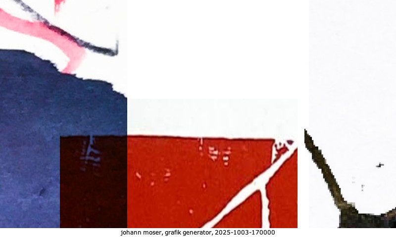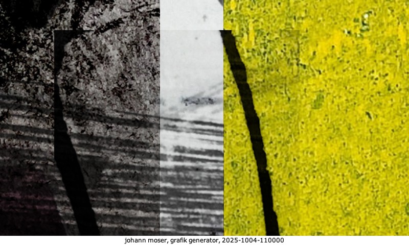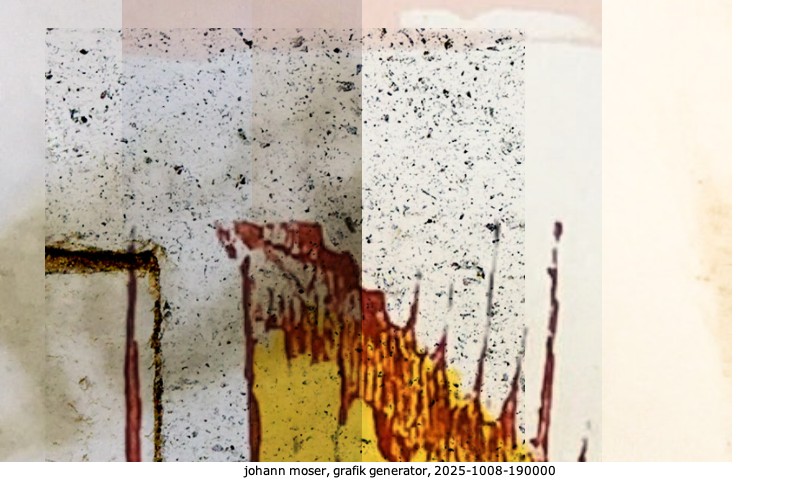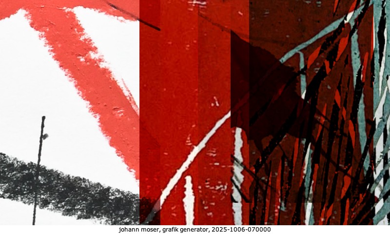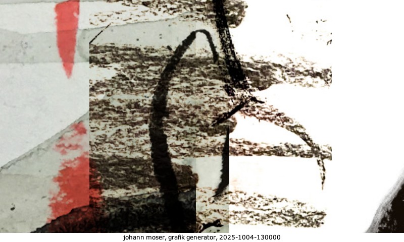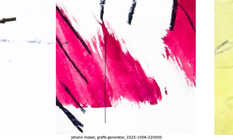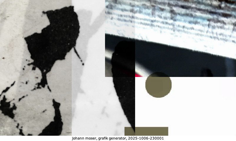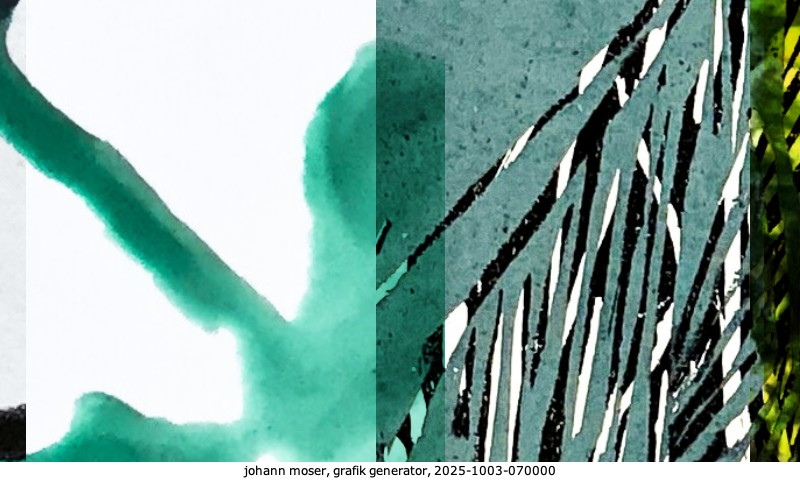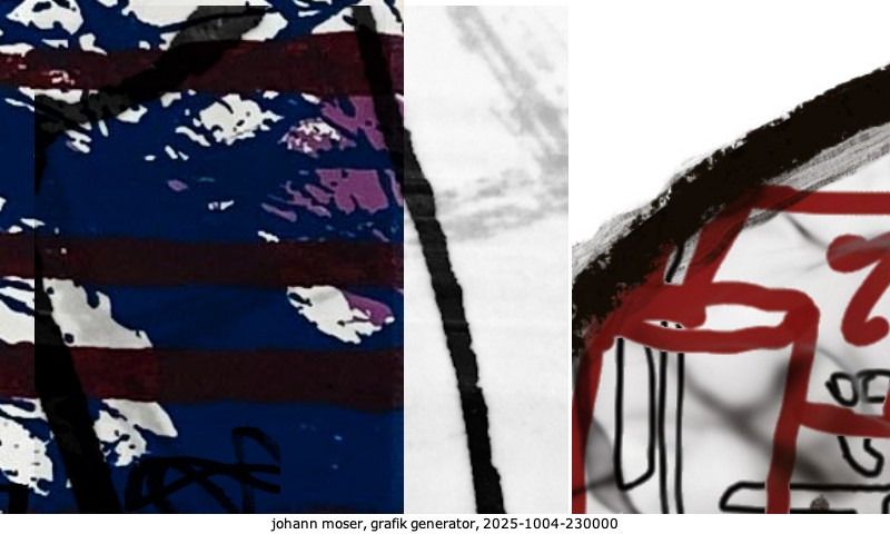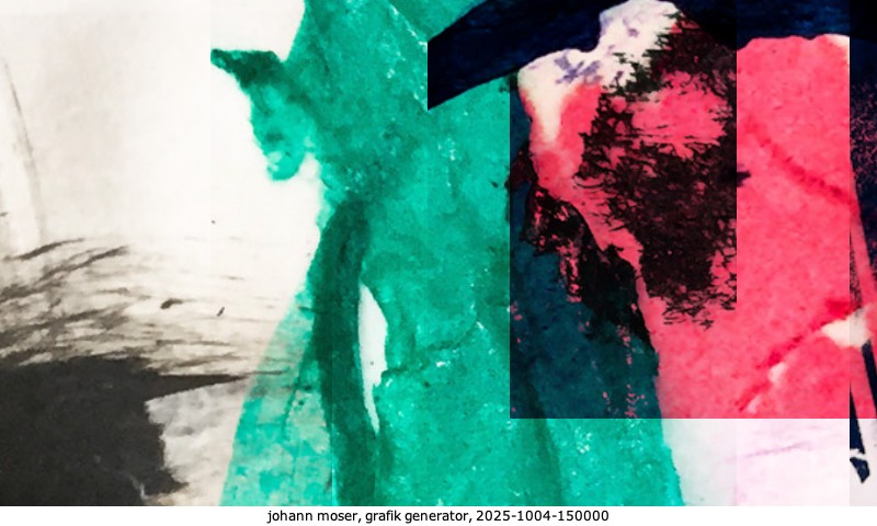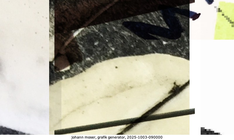 Das Projekt grafik generator habe ich in mehreren Beiträgen auf kunst.standpunkte.at beschrieben. Die Grafiken werden aus einer Sammlung von derzeit meiner Bilder, Zeichnungen und Grafiken generiert. Diese Basis werde ich laufend erweitern. Damit ändert sich ganz langsam die Ästhetik der vom grafik generator generierten Bilder. Die Signatur gehört zum Bild und weist es als Teil eines umfassenderen Projekts aus. Bitte lasse die Signatur daher auf dem Bild.