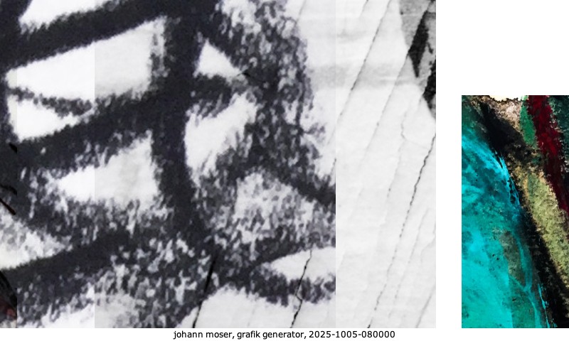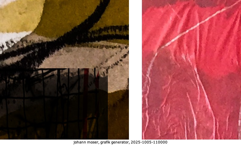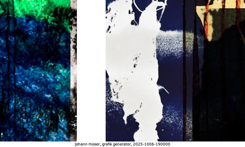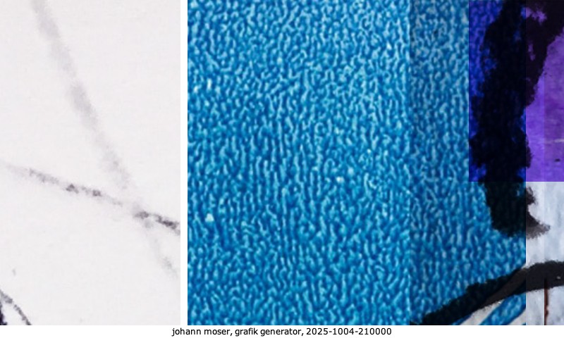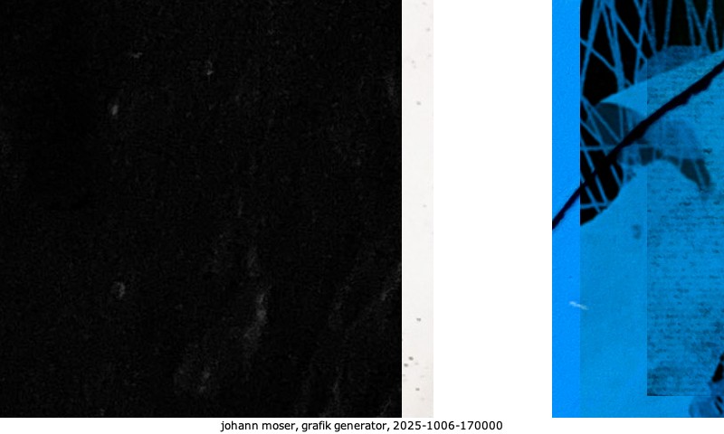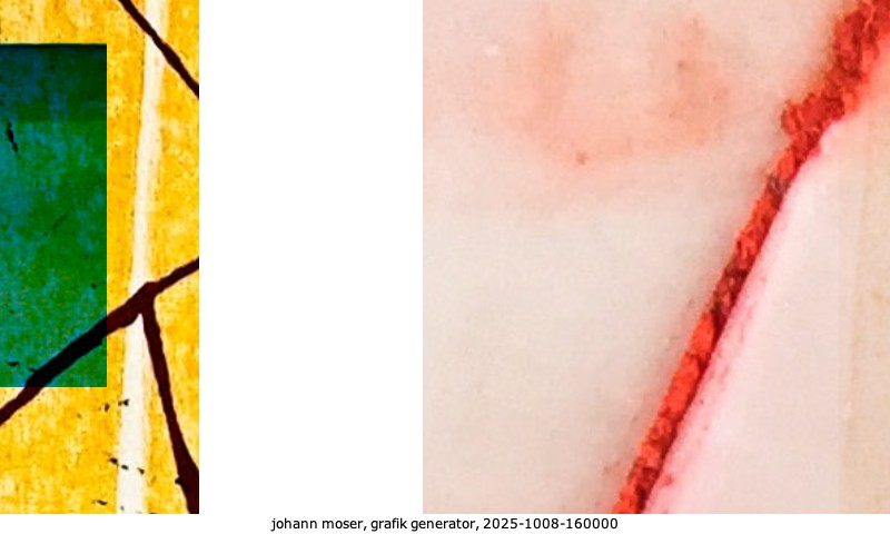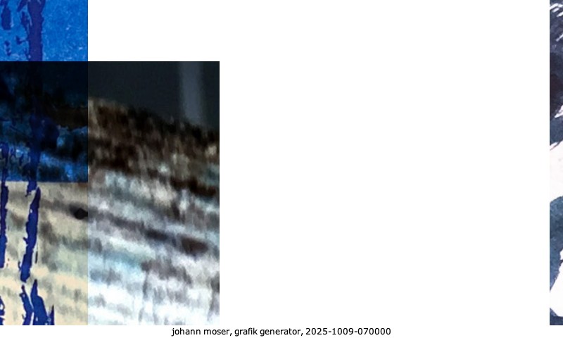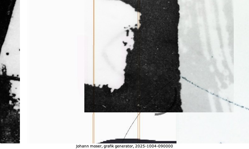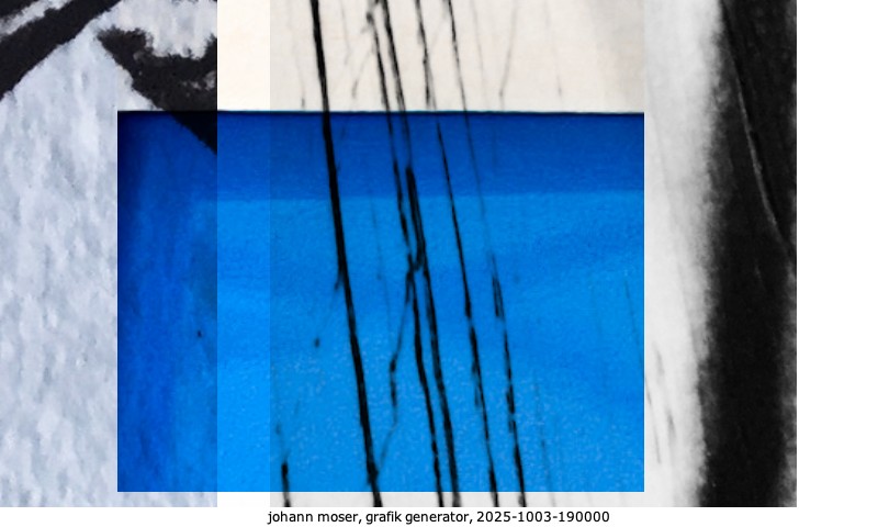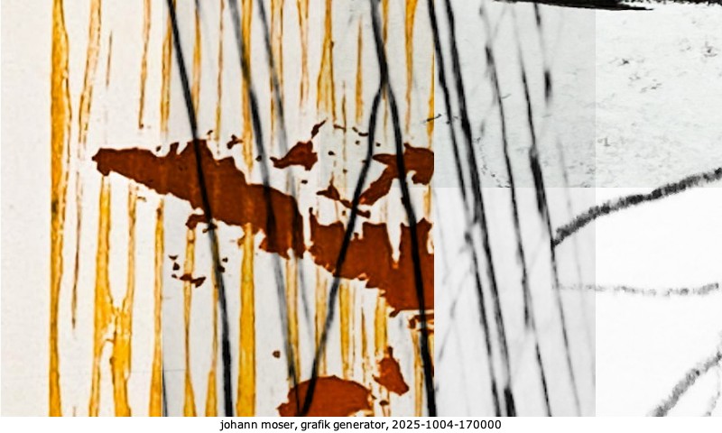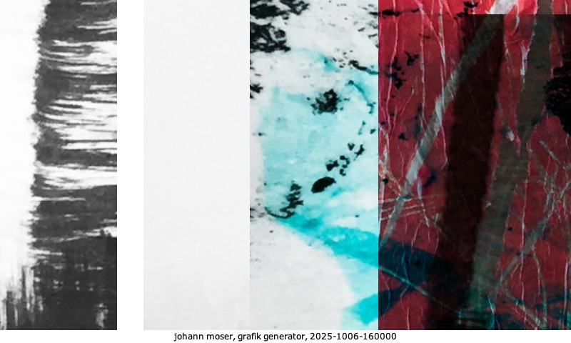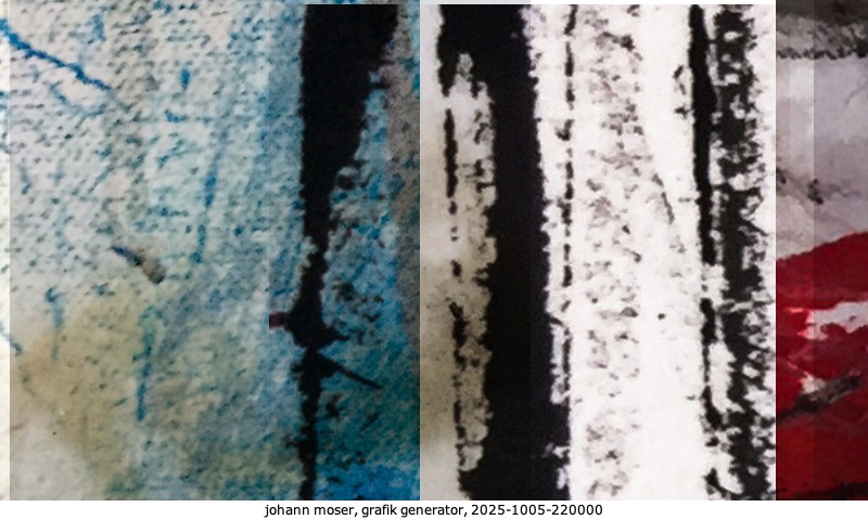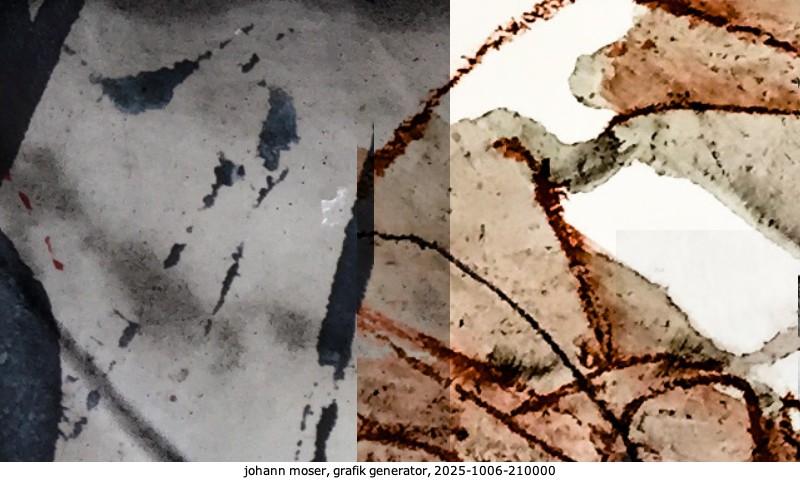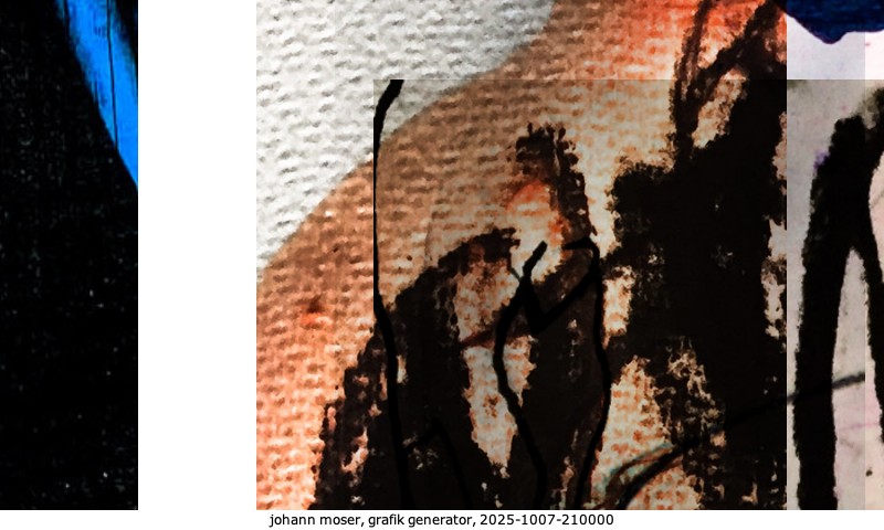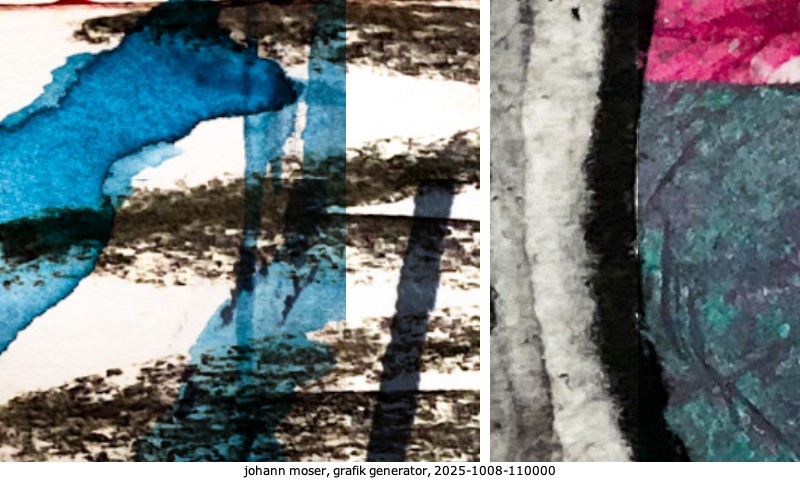 Das Projekt grafik generator habe ich in mehreren Beiträgen auf kunst.standpunkte.at beschrieben. Die Grafiken werden aus einer Sammlung von derzeit meiner Bilder, Zeichnungen und Grafiken generiert. Diese Basis werde ich laufend erweitern. Damit ändert sich ganz langsam die Ästhetik der vom grafik generator generierten Bilder. Die Signatur gehört zum Bild und weist es als Teil eines umfassenderen Projekts aus. Bitte lasse die Signatur daher auf dem Bild.
