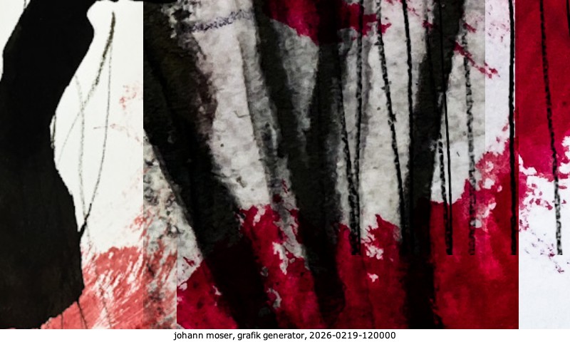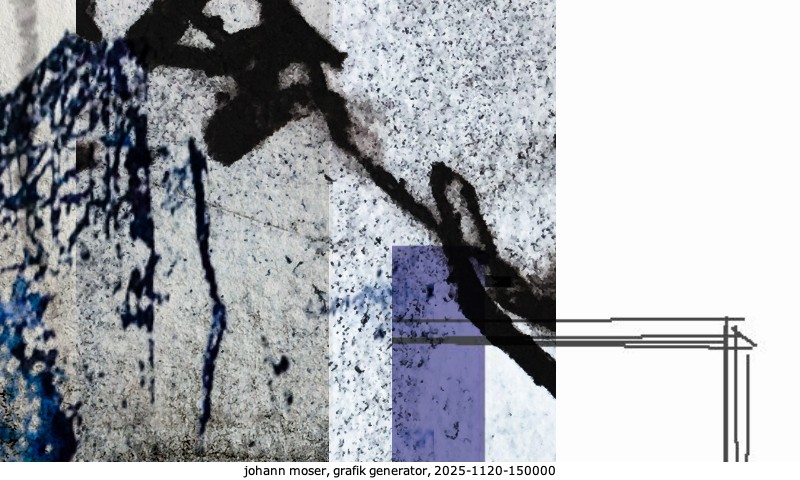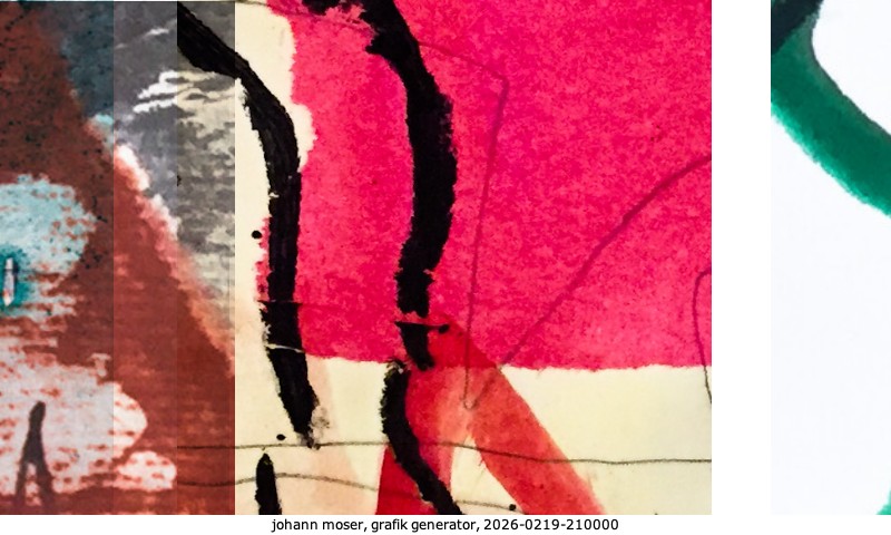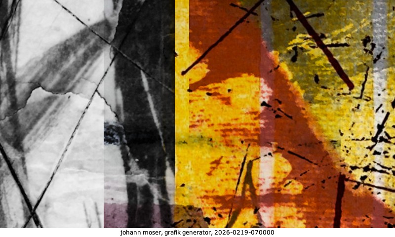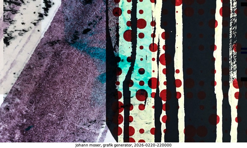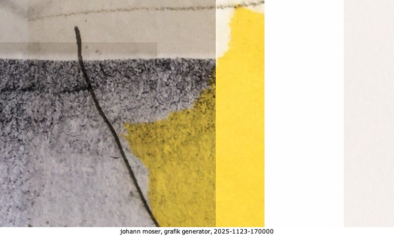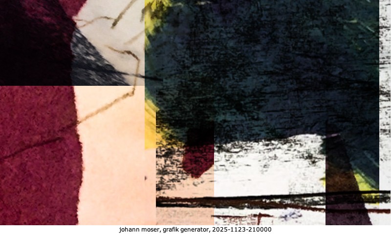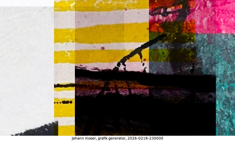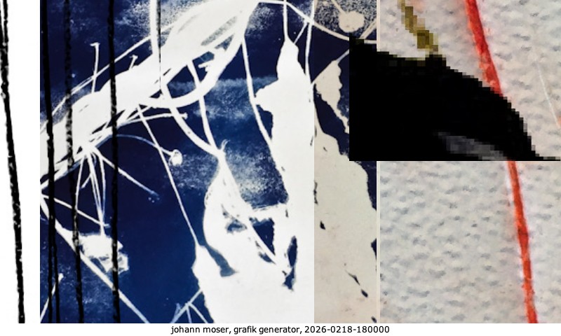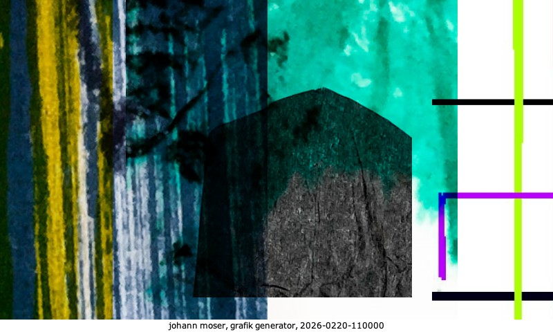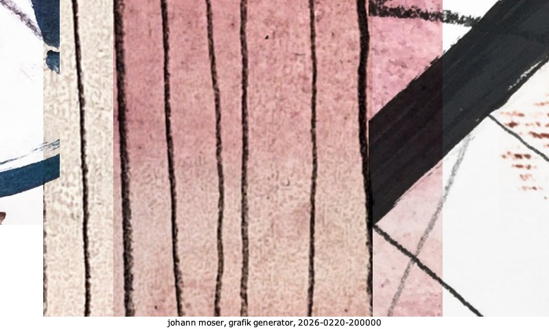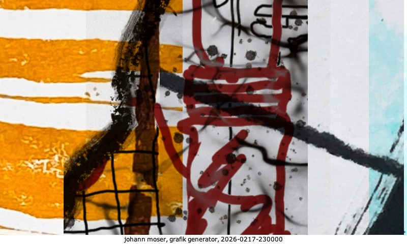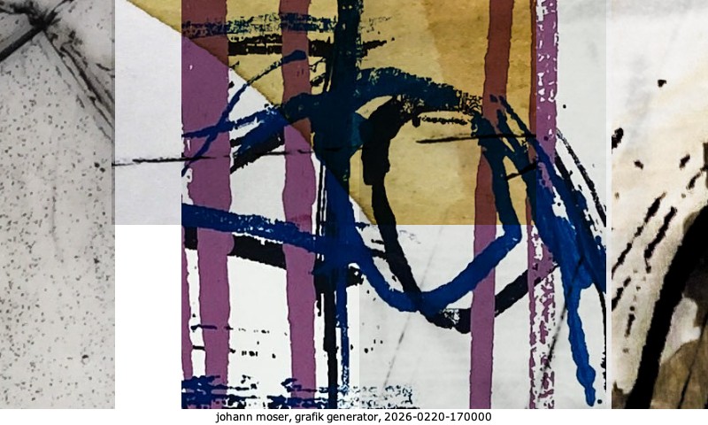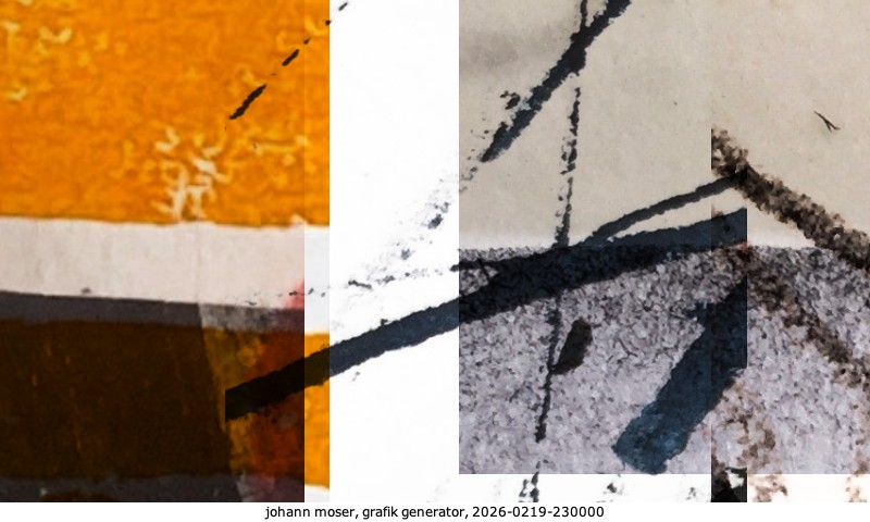 Das Projekt grafik generator habe ich in mehreren Beiträgen auf kunst.standpunkte.at beschrieben. Die Grafiken werden aus einer Sammlung von derzeit meiner Bilder, Zeichnungen und Grafiken generiert. Diese Basis werde ich laufend erweitern. Damit ändert sich ganz langsam die Ästhetik der vom grafik generator generierten Bilder. Die Signatur gehört zum Bild und weist es als Teil eines umfassenderen Projekts aus. Bitte lasse die Signatur daher auf dem Bild.