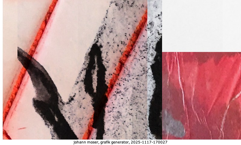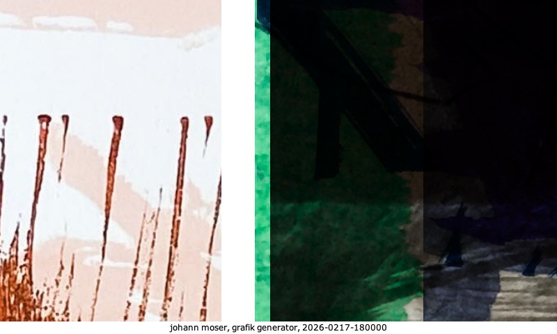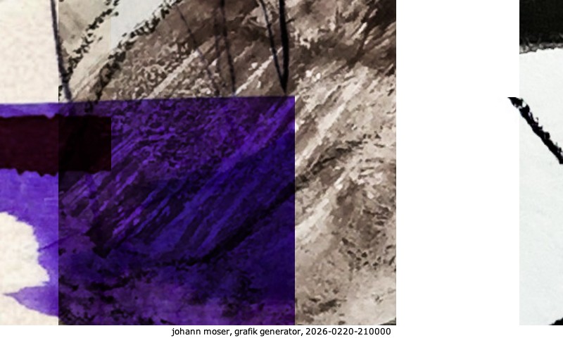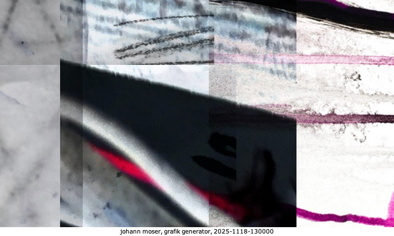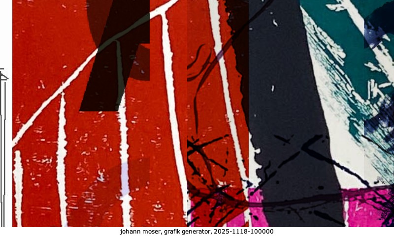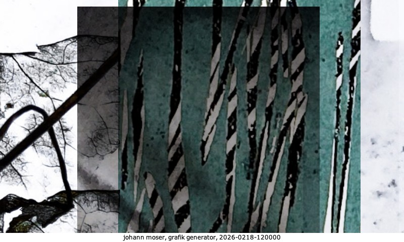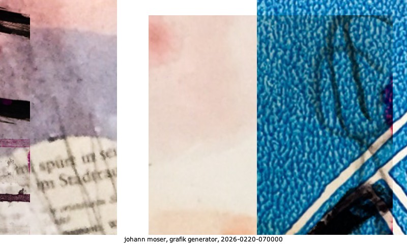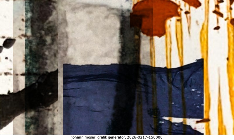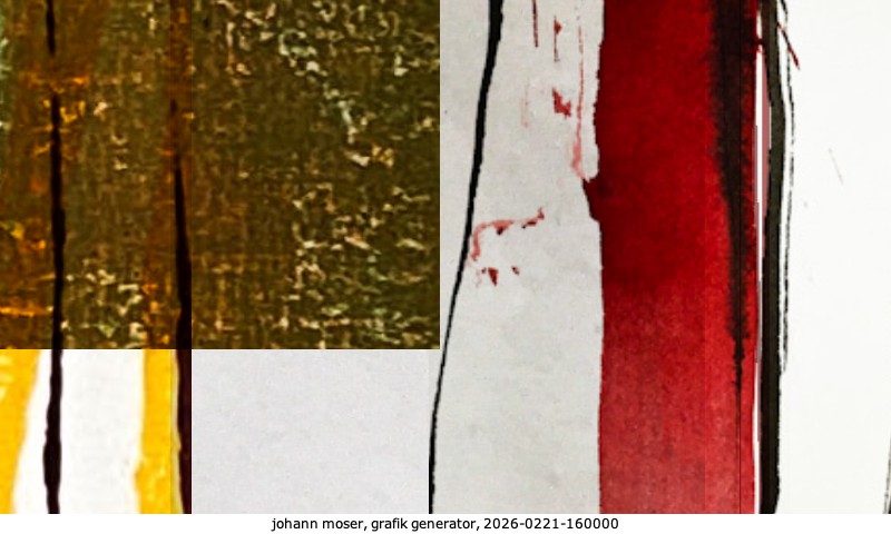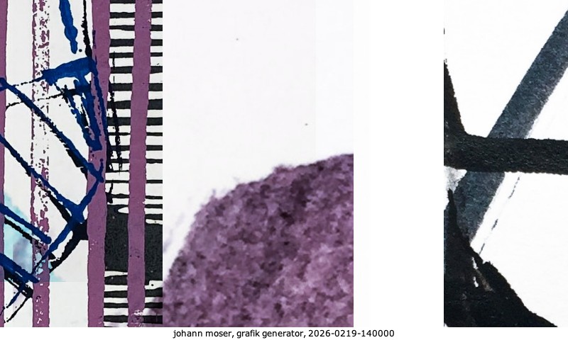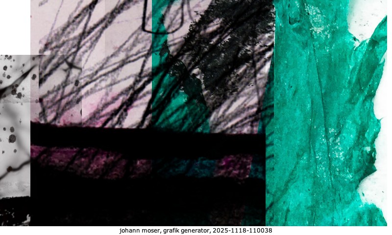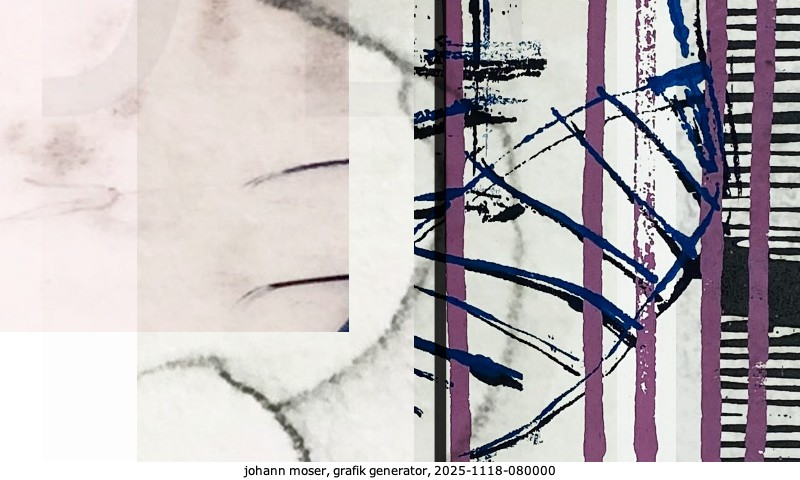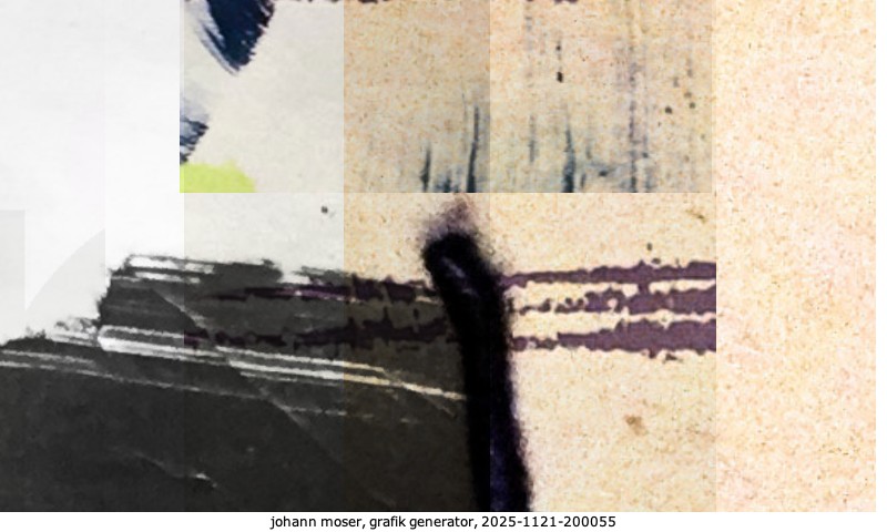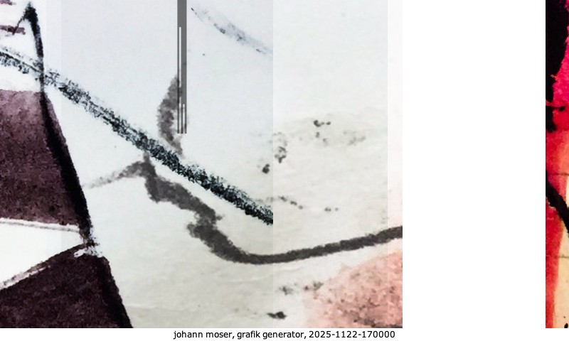 Das Projekt grafik generator habe ich in mehreren Beiträgen auf kunst.standpunkte.at beschrieben. Die Grafiken werden aus einer Sammlung von derzeit meiner Bilder, Zeichnungen und Grafiken generiert. Diese Basis werde ich laufend erweitern. Damit ändert sich ganz langsam die Ästhetik der vom grafik generator generierten Bilder. Die Signatur gehört zum Bild und weist es als Teil eines umfassenderen Projekts aus. Bitte lasse die Signatur daher auf dem Bild.