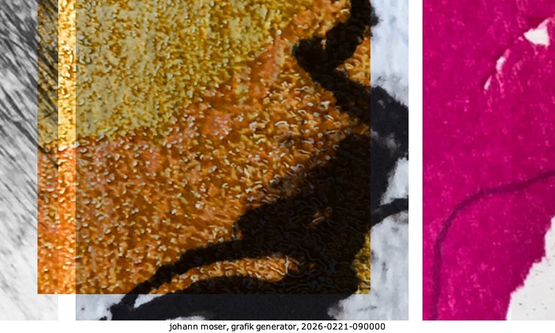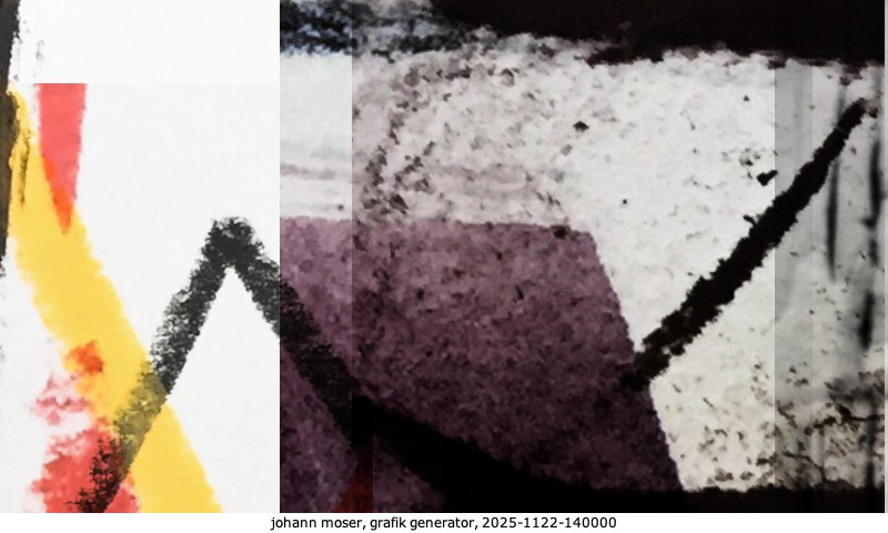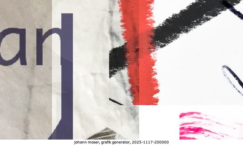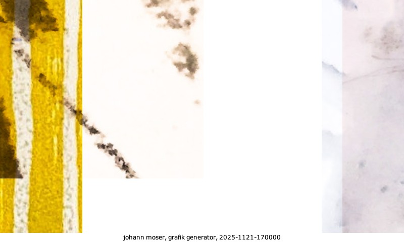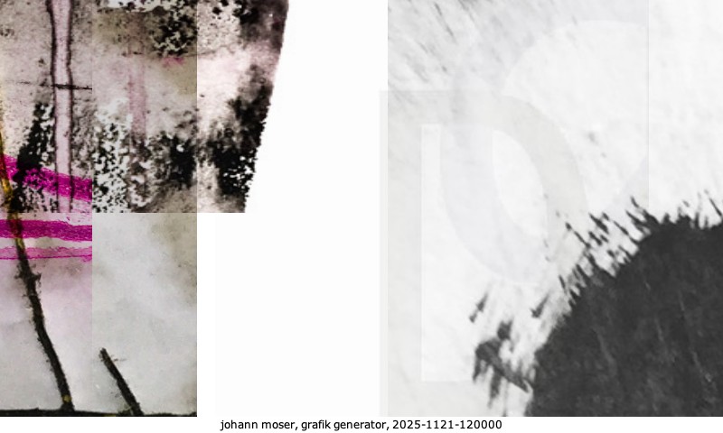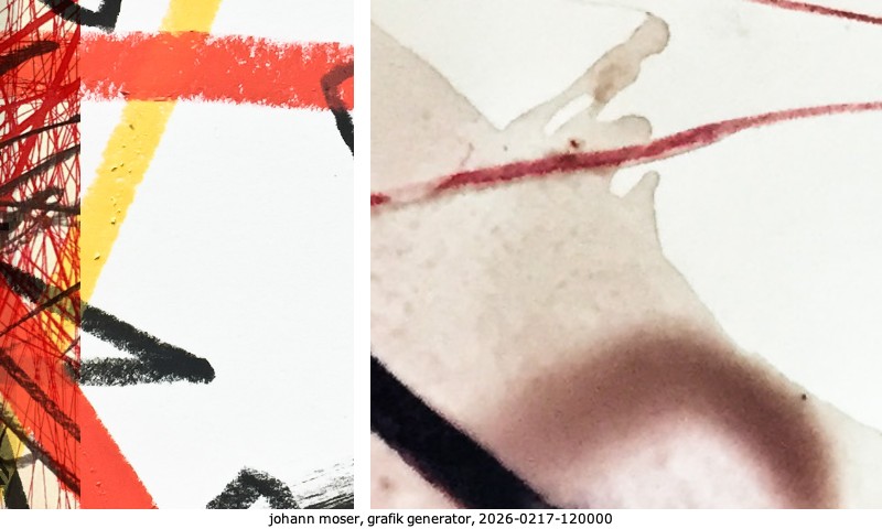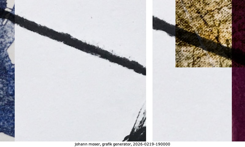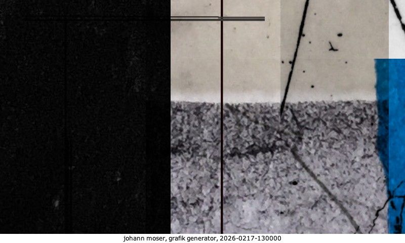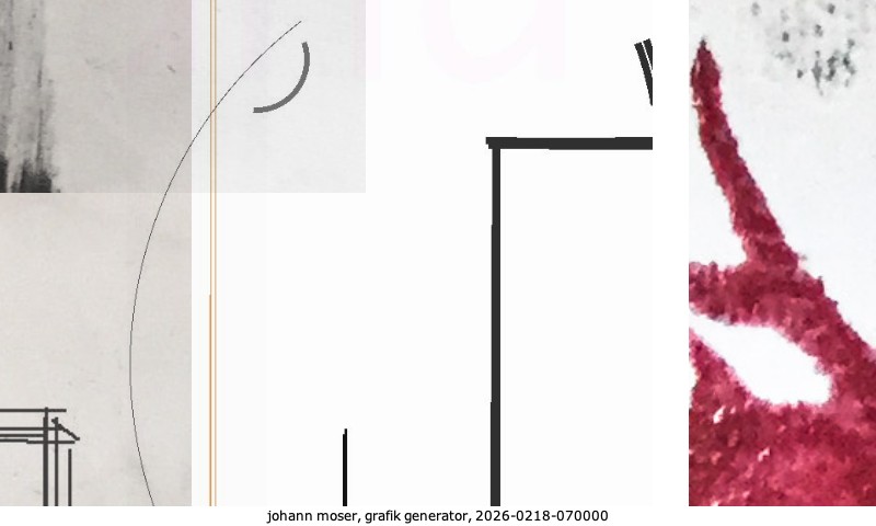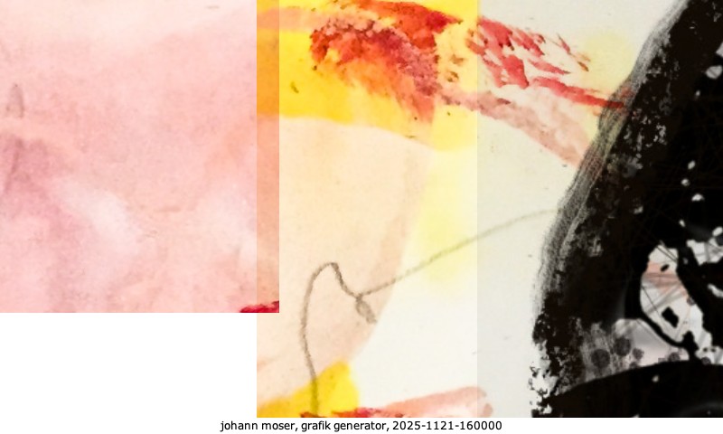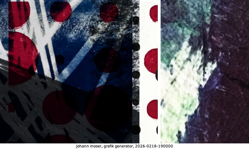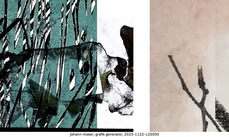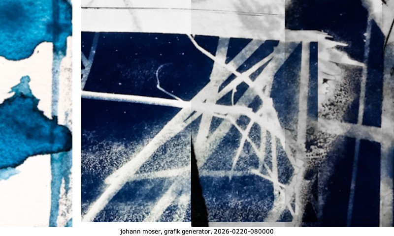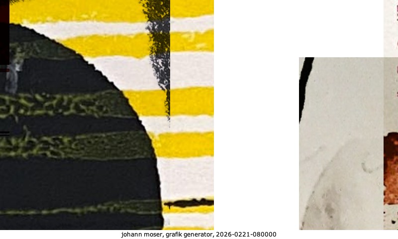 Das Projekt grafik generator habe ich in mehreren Beiträgen auf kunst.standpunkte.at beschrieben. Die Grafiken werden aus einer Sammlung von derzeit meiner Bilder, Zeichnungen und Grafiken generiert. Diese Basis werde ich laufend erweitern. Damit ändert sich ganz langsam die Ästhetik der vom grafik generator generierten Bilder. Die Signatur gehört zum Bild und weist es als Teil eines umfassenderen Projekts aus. Bitte lasse die Signatur daher auf dem Bild.