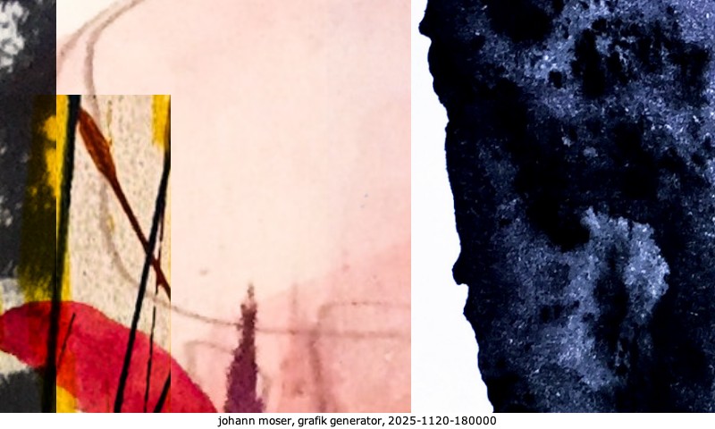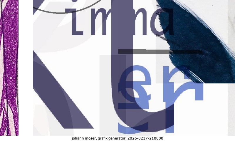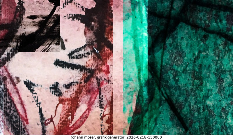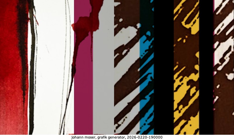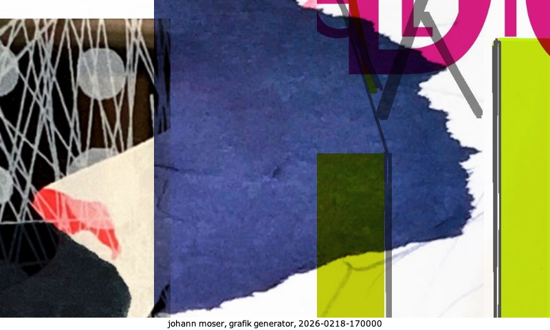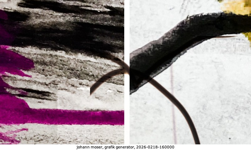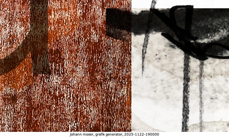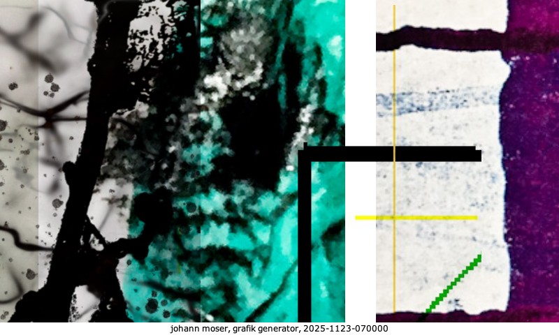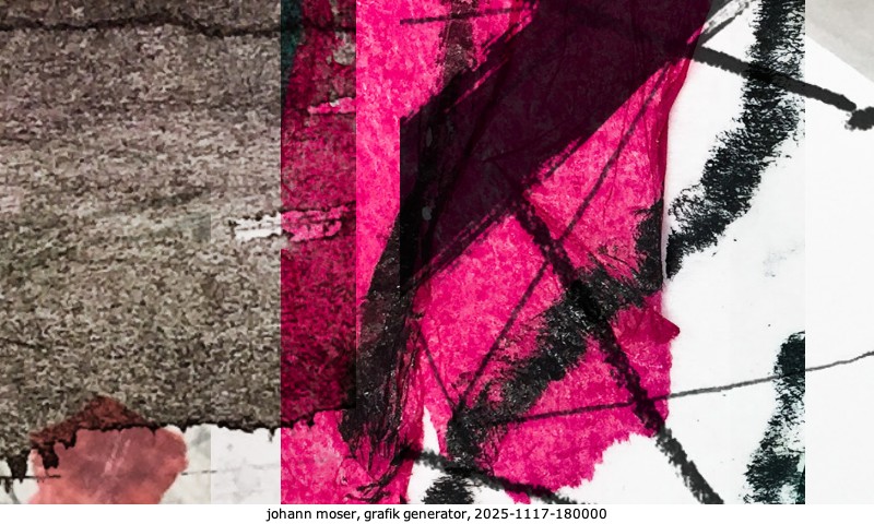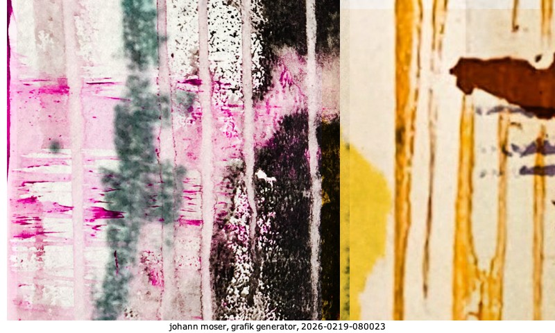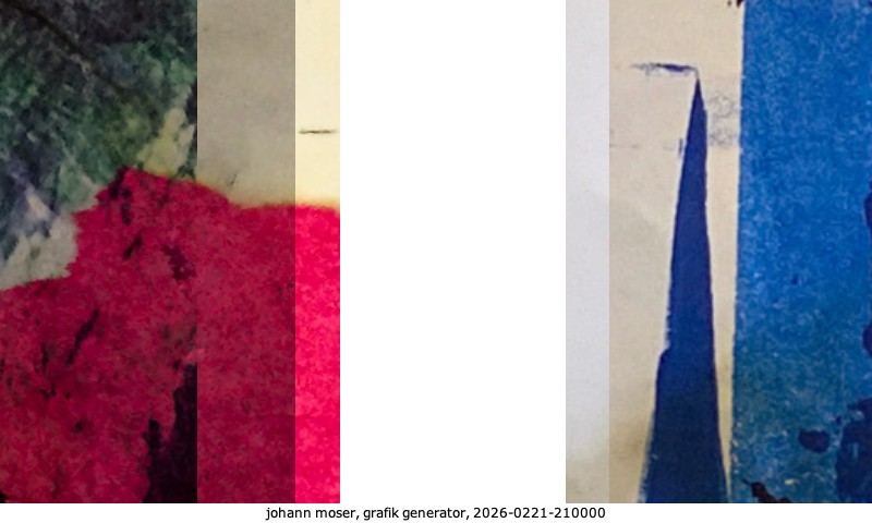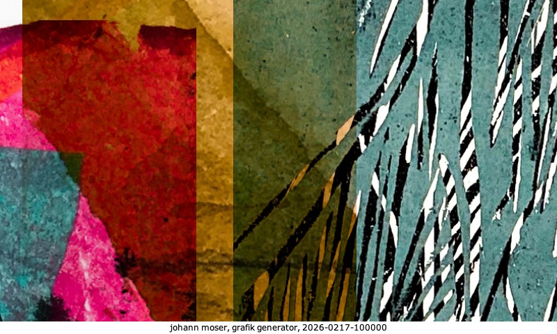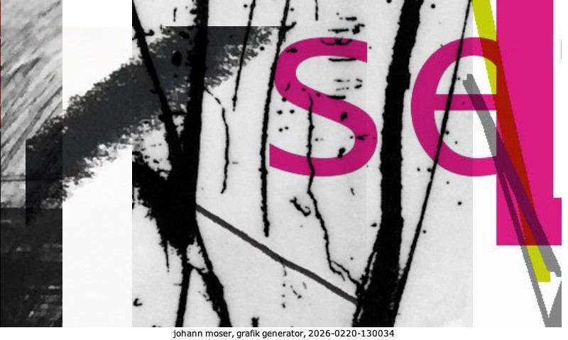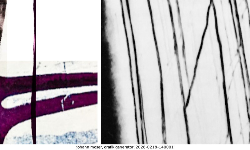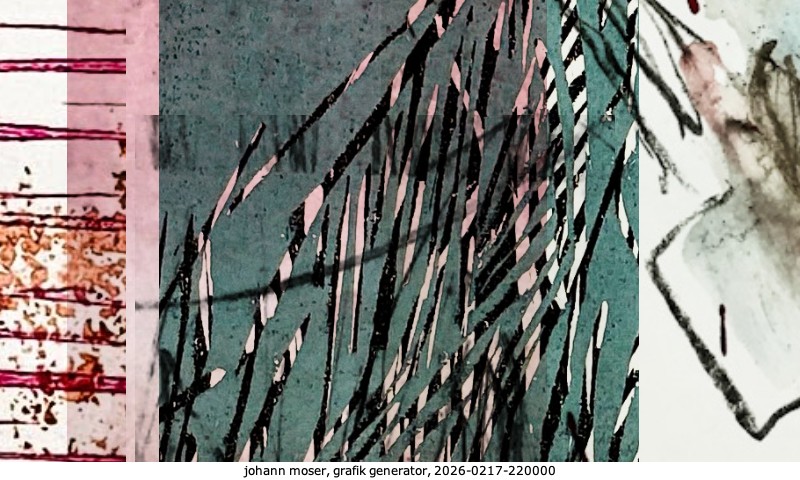 Das Projekt grafik generator habe ich in mehreren Beiträgen auf kunst.standpunkte.at beschrieben. Die Grafiken werden aus einer Sammlung von derzeit meiner Bilder, Zeichnungen und Grafiken generiert. Diese Basis werde ich laufend erweitern. Damit ändert sich ganz langsam die Ästhetik der vom grafik generator generierten Bilder. Die Signatur gehört zum Bild und weist es als Teil eines umfassenderen Projekts aus. Bitte lasse die Signatur daher auf dem Bild.