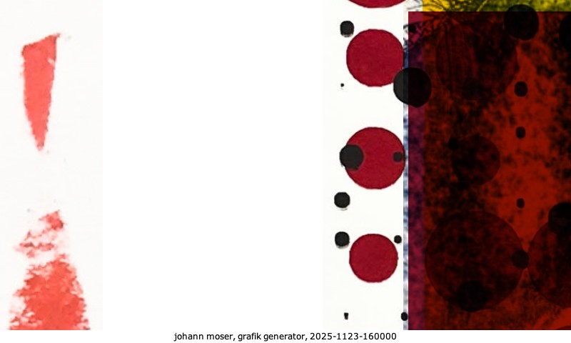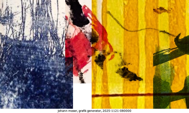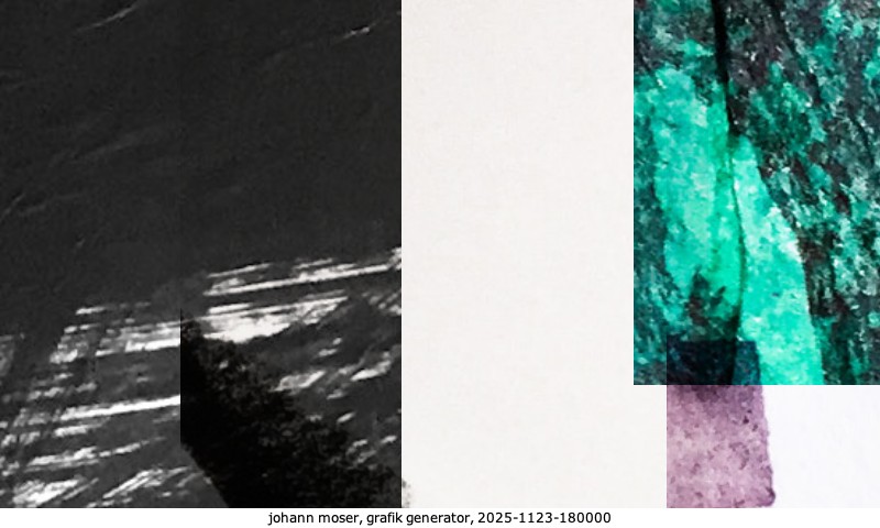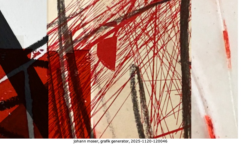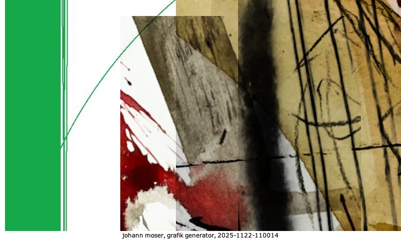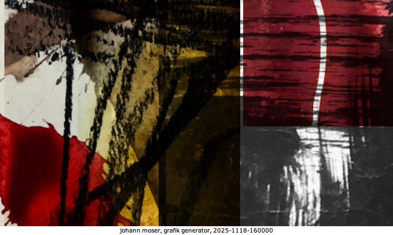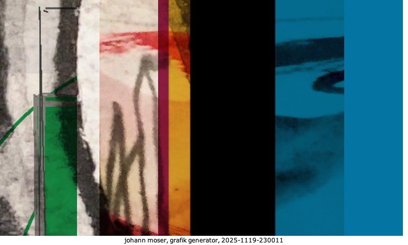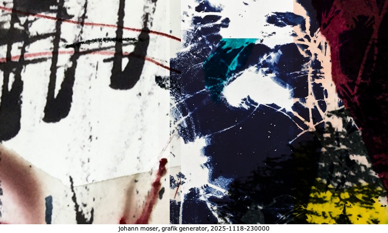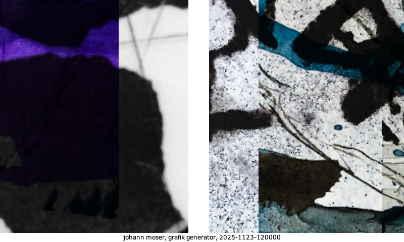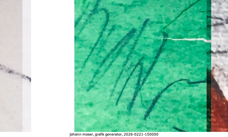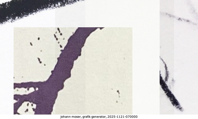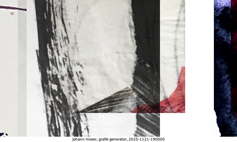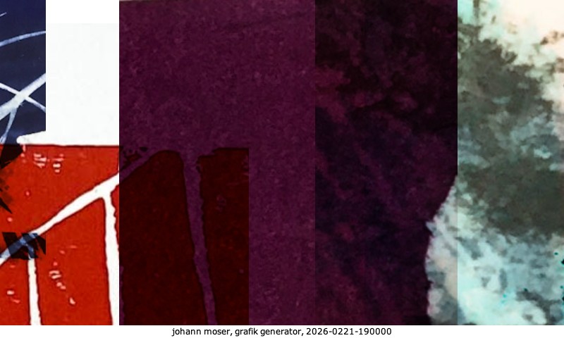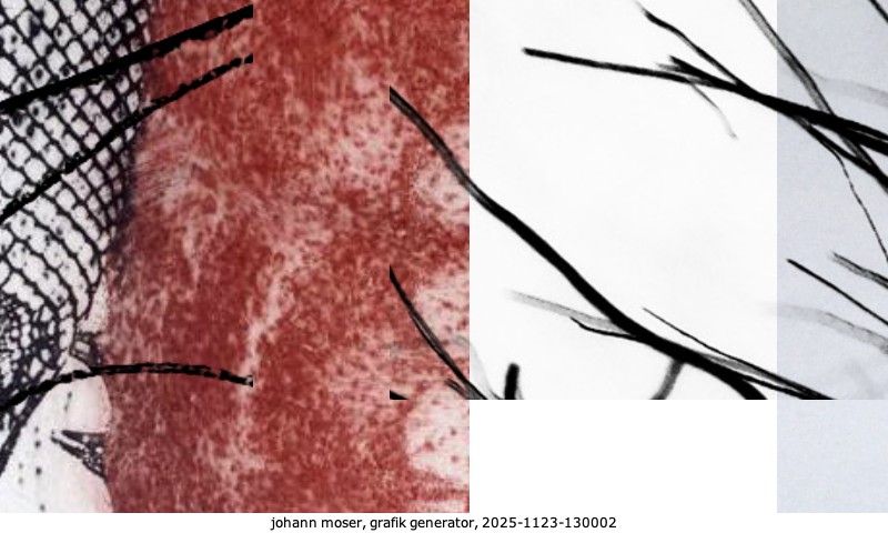 Das Projekt grafik generator habe ich in mehreren Beiträgen auf kunst.standpunkte.at beschrieben. Die Grafiken werden aus einer Sammlung von derzeit meiner Bilder, Zeichnungen und Grafiken generiert. Diese Basis werde ich laufend erweitern. Damit ändert sich ganz langsam die Ästhetik der vom grafik generator generierten Bilder. Die Signatur gehört zum Bild und weist es als Teil eines umfassenderen Projekts aus. Bitte lasse die Signatur daher auf dem Bild.