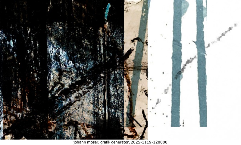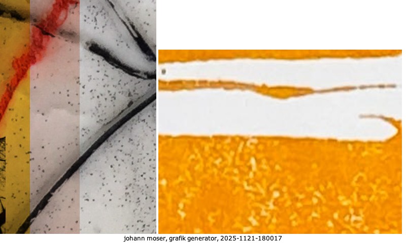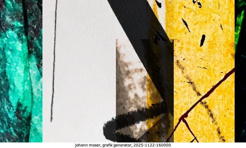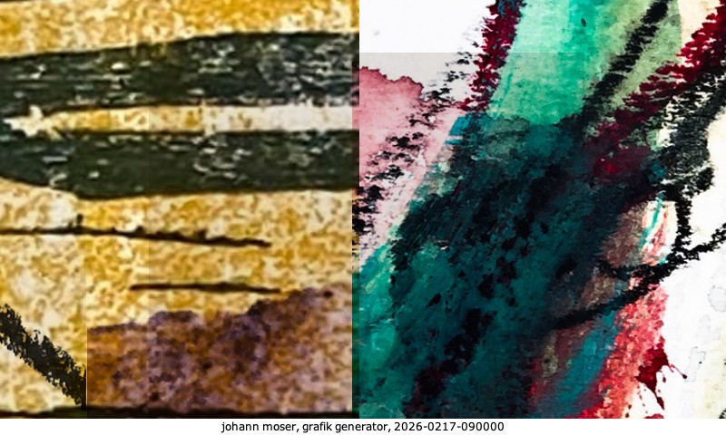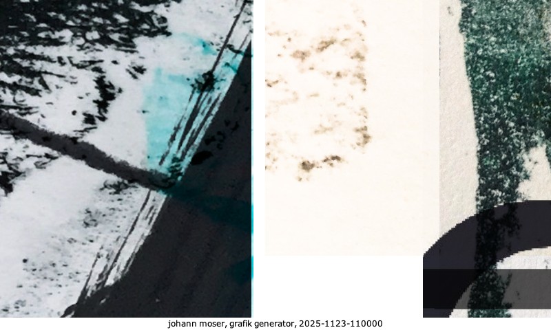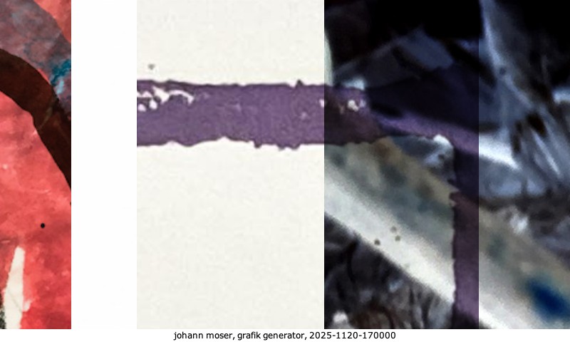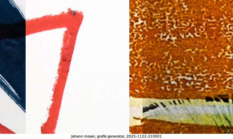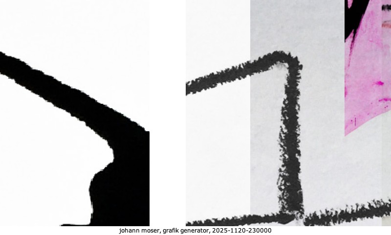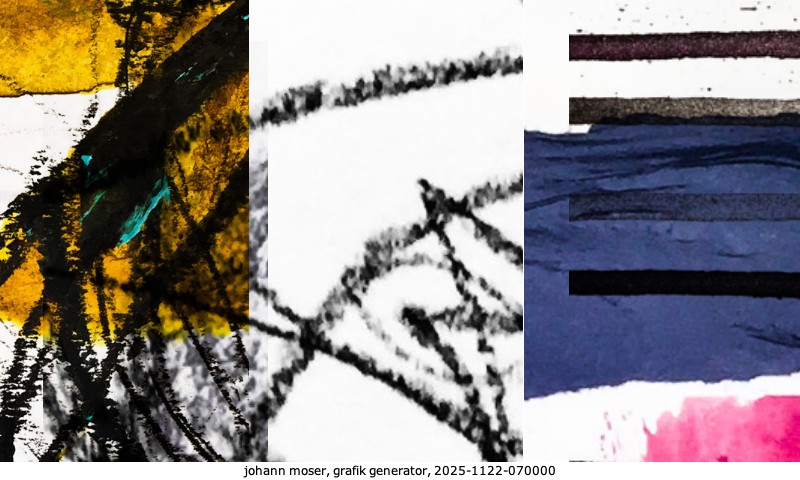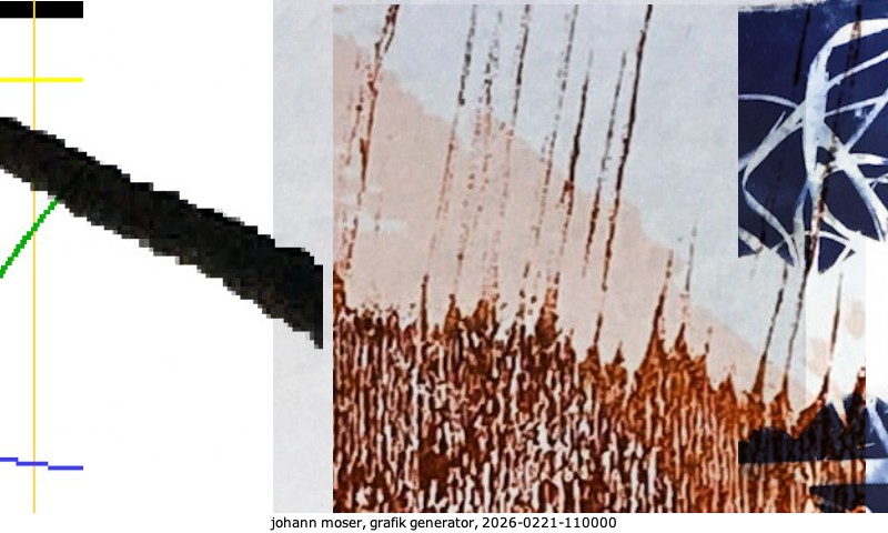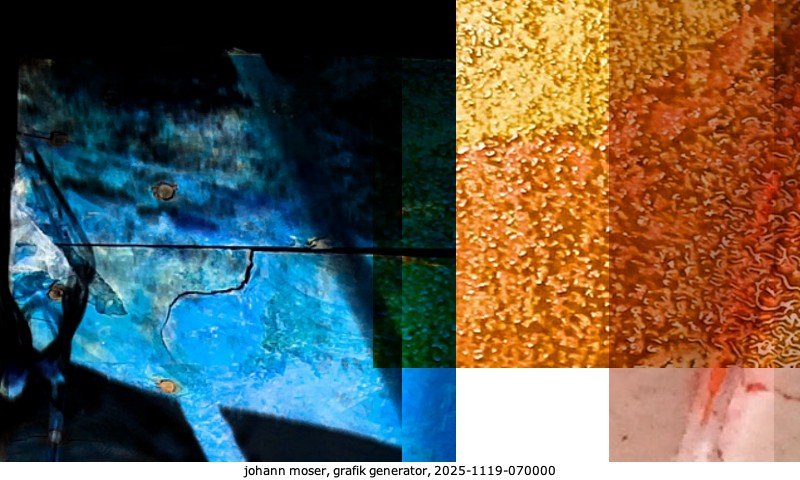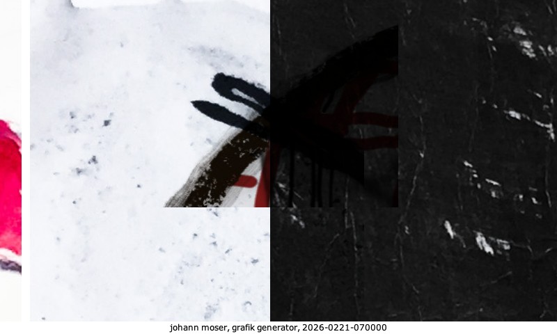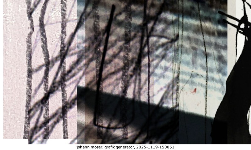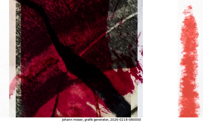 Das Projekt grafik generator habe ich in mehreren Beiträgen auf kunst.standpunkte.at beschrieben. Die Grafiken werden aus einer Sammlung von derzeit meiner Bilder, Zeichnungen und Grafiken generiert. Diese Basis werde ich laufend erweitern. Damit ändert sich ganz langsam die Ästhetik der vom grafik generator generierten Bilder. Die Signatur gehört zum Bild und weist es als Teil eines umfassenderen Projekts aus. Bitte lasse die Signatur daher auf dem Bild.
