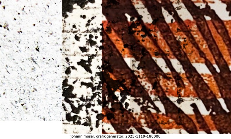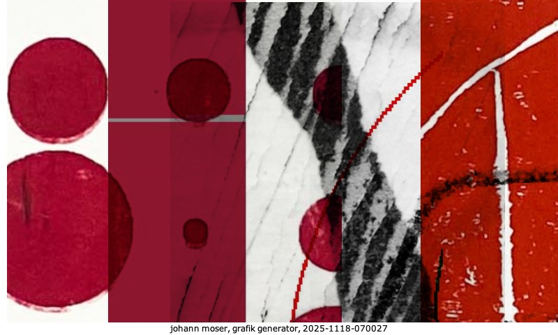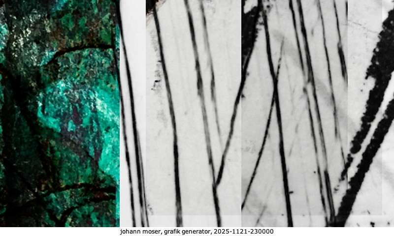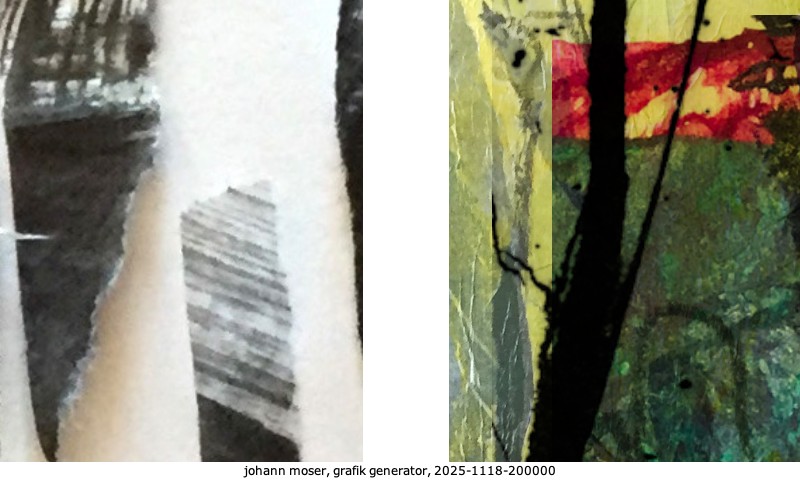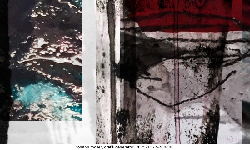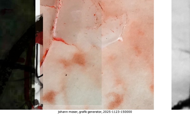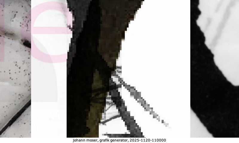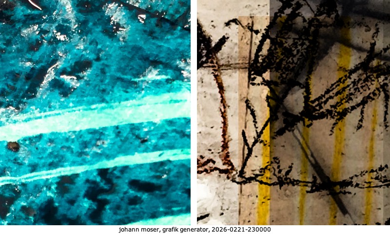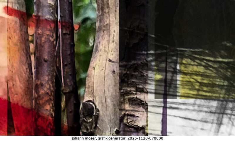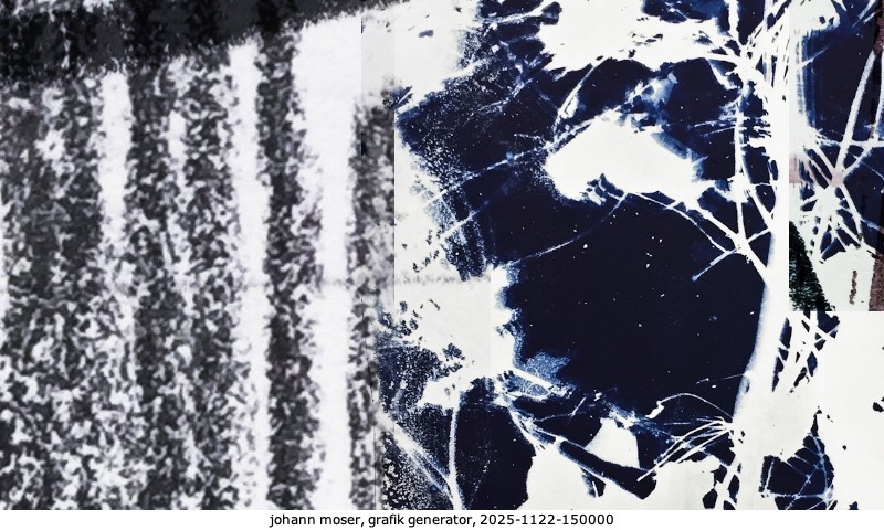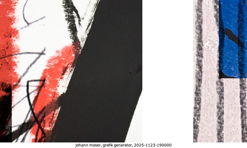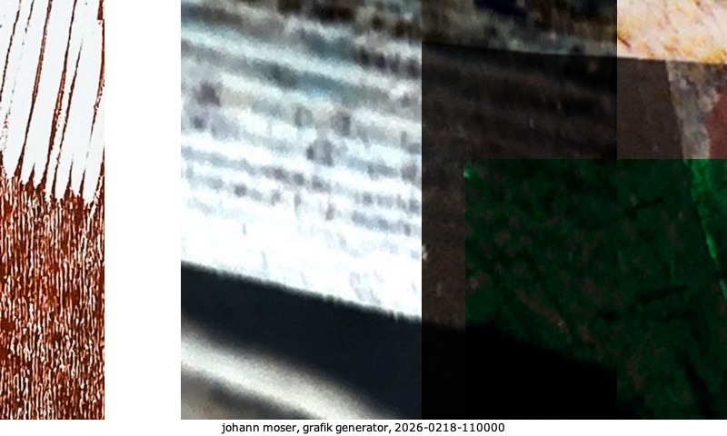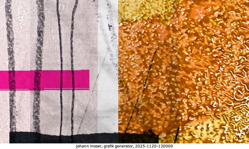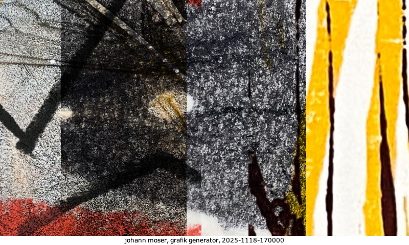 Das Projekt grafik generator habe ich in mehreren Beiträgen auf kunst.standpunkte.at beschrieben. Die Grafiken werden aus einer Sammlung von derzeit meiner Bilder, Zeichnungen und Grafiken generiert. Diese Basis werde ich laufend erweitern. Damit ändert sich ganz langsam die Ästhetik der vom grafik generator generierten Bilder. Die Signatur gehört zum Bild und weist es als Teil eines umfassenderen Projekts aus. Bitte lasse die Signatur daher auf dem Bild.